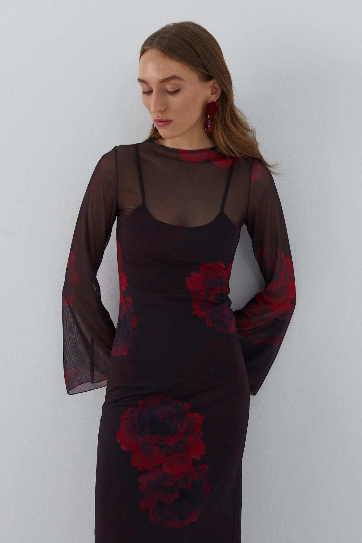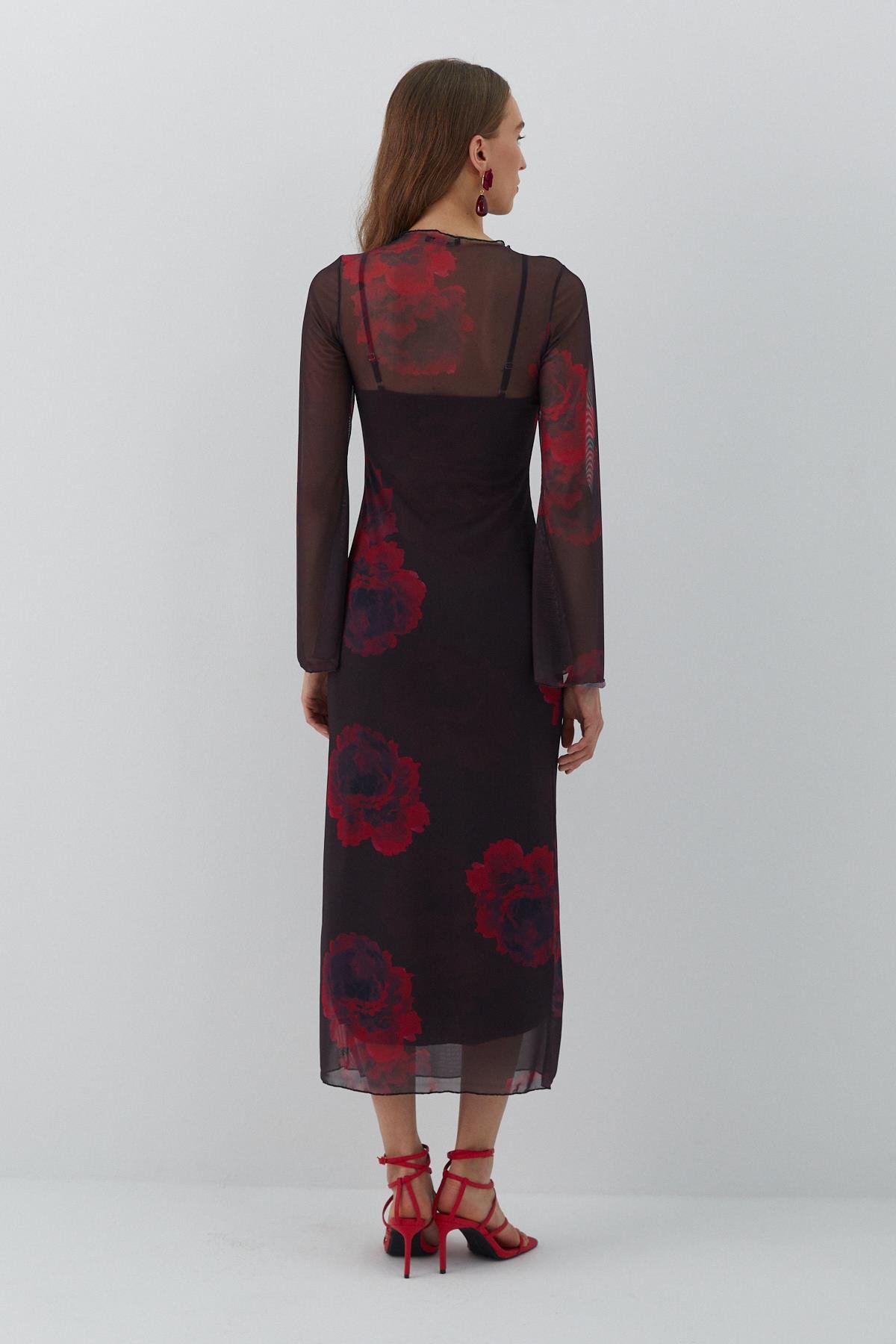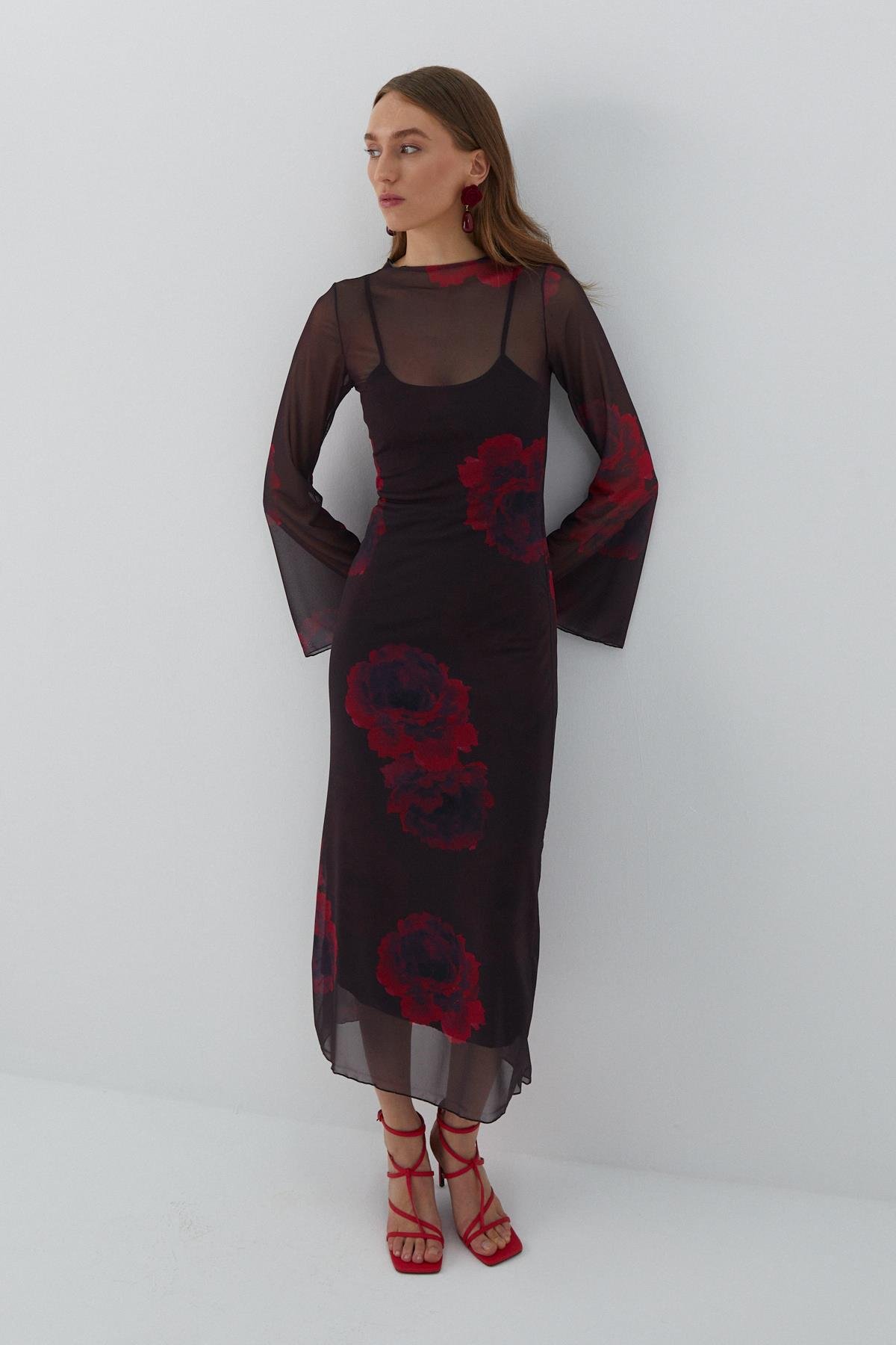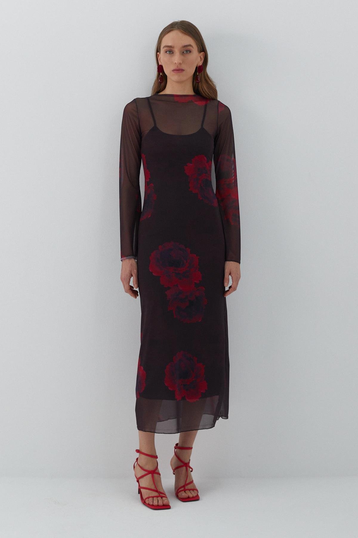 Astarlı Gül Baskılı Uzun Şifon Elbise Kırmızı (RN5424_010)