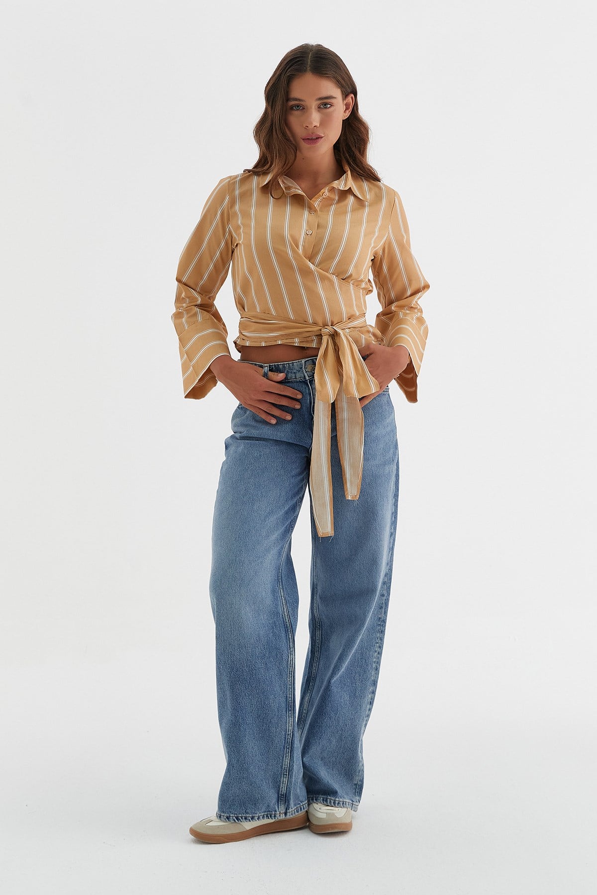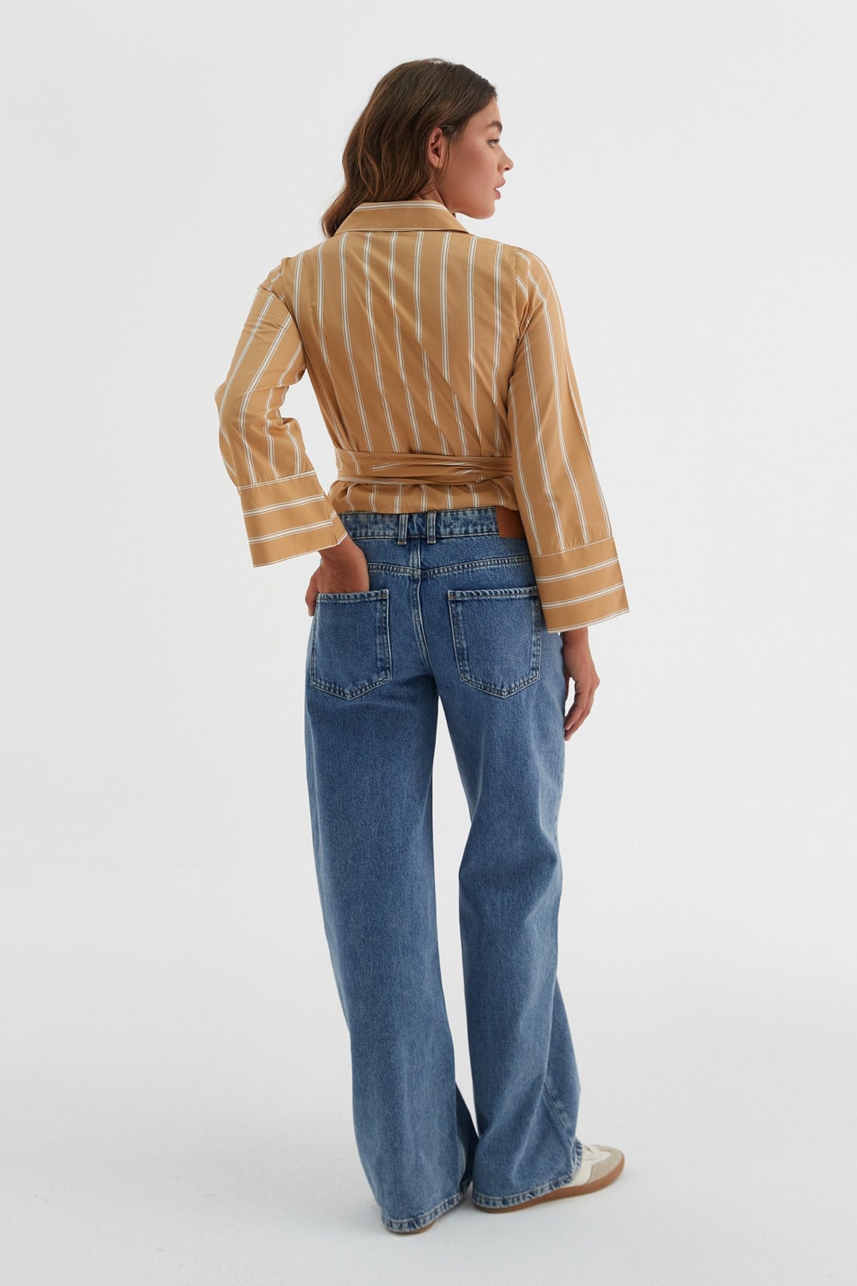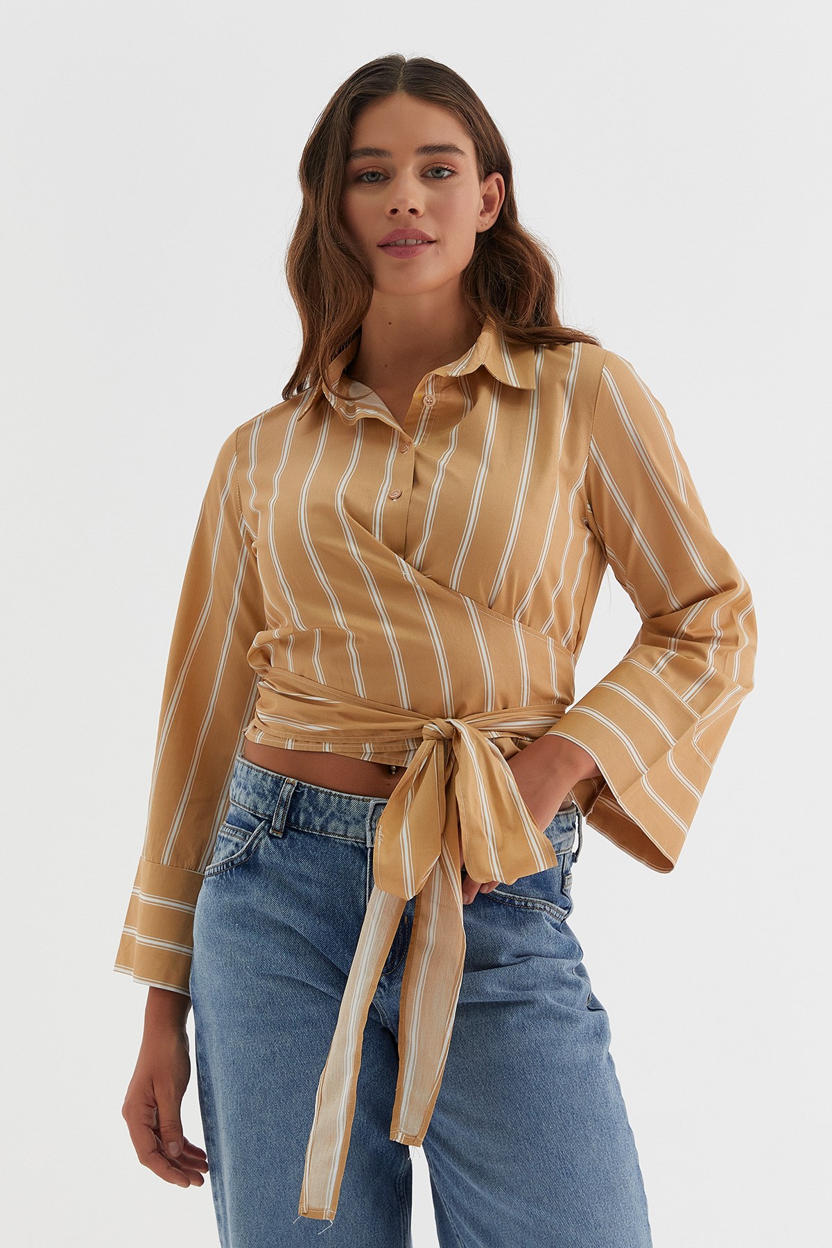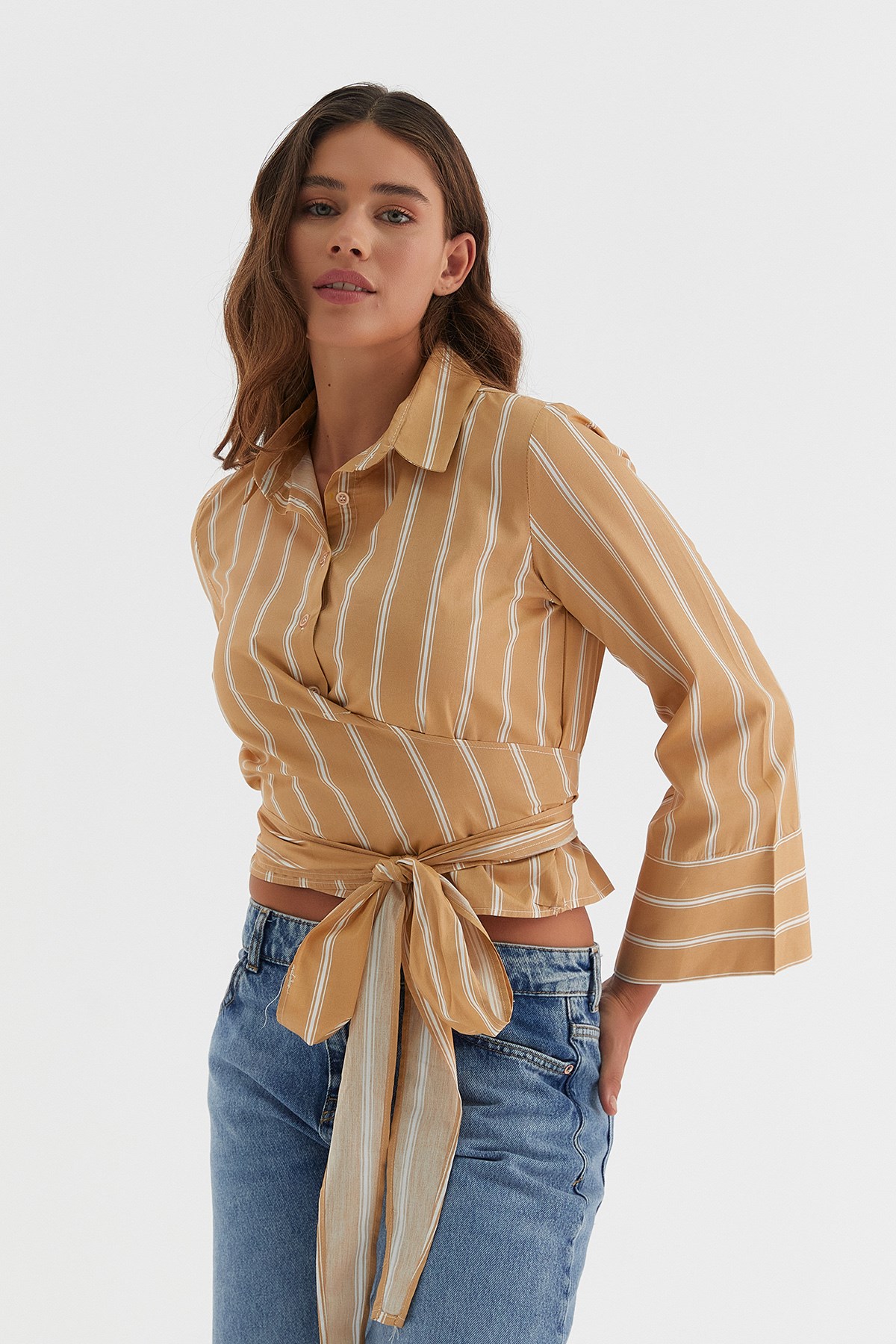 Çizgili Belden Bağlamalı Gömlek Camel (ML1064_021)