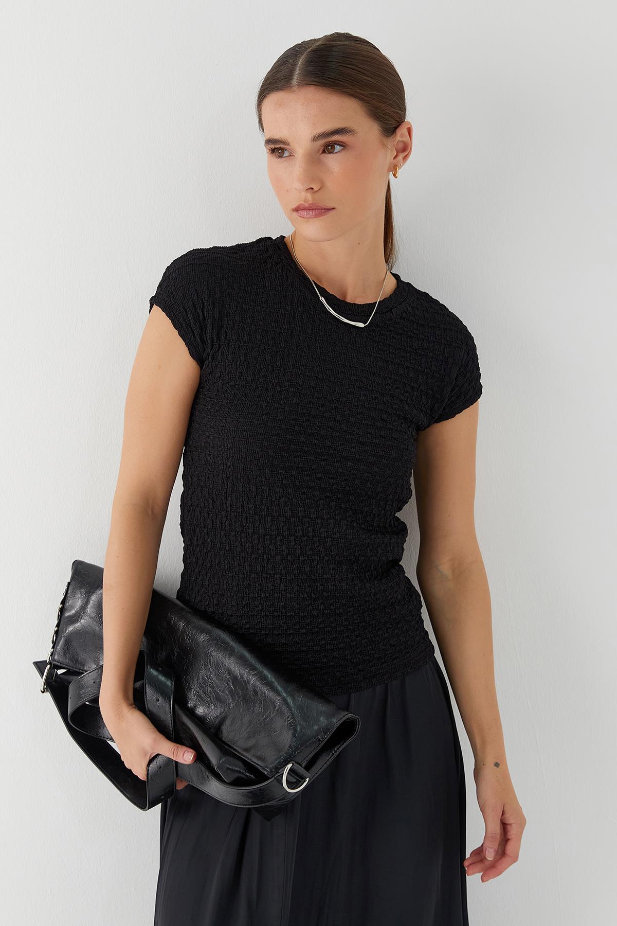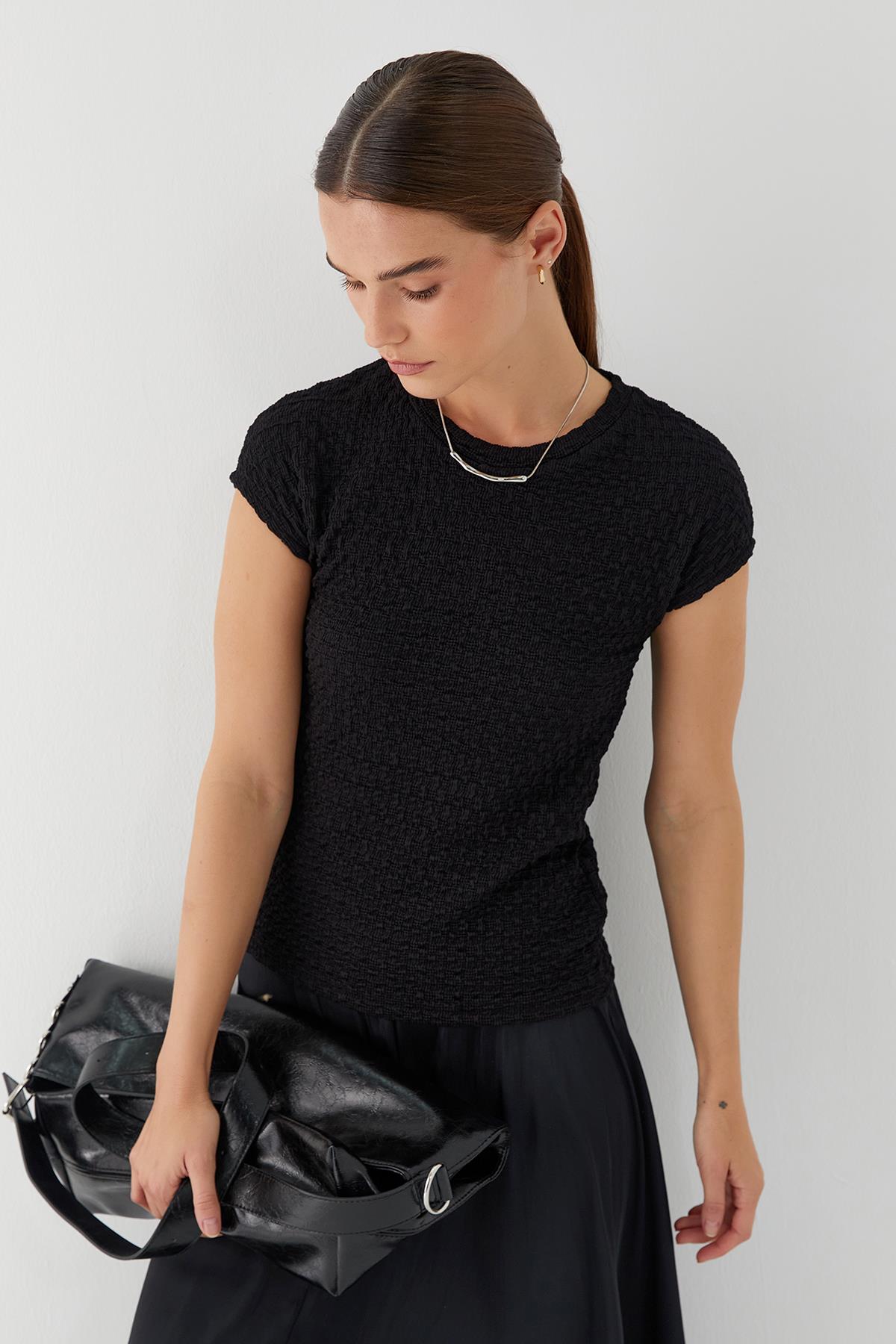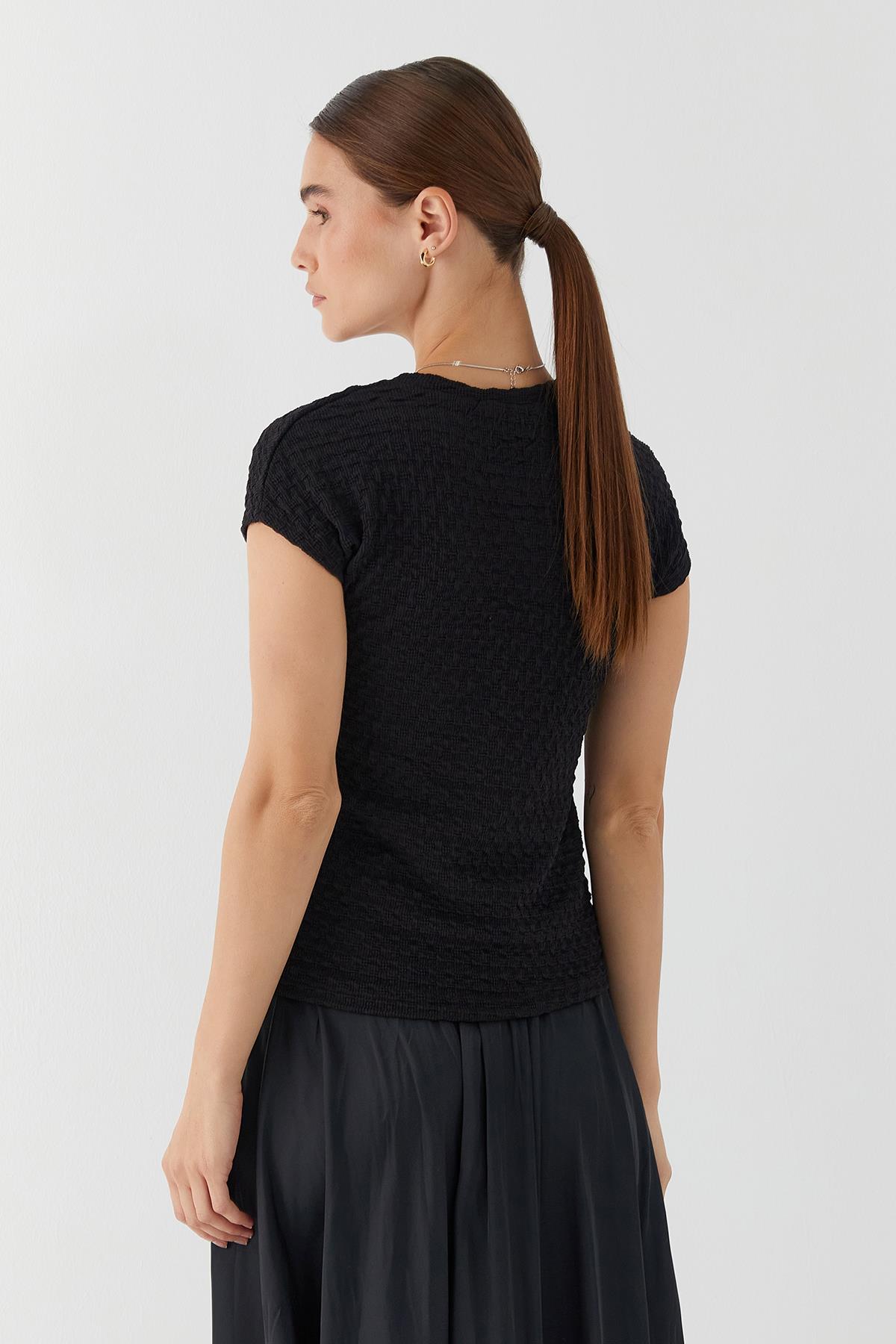 Dolgulu Bisiklet Yaka Bluz Siyah (MF1050_001)