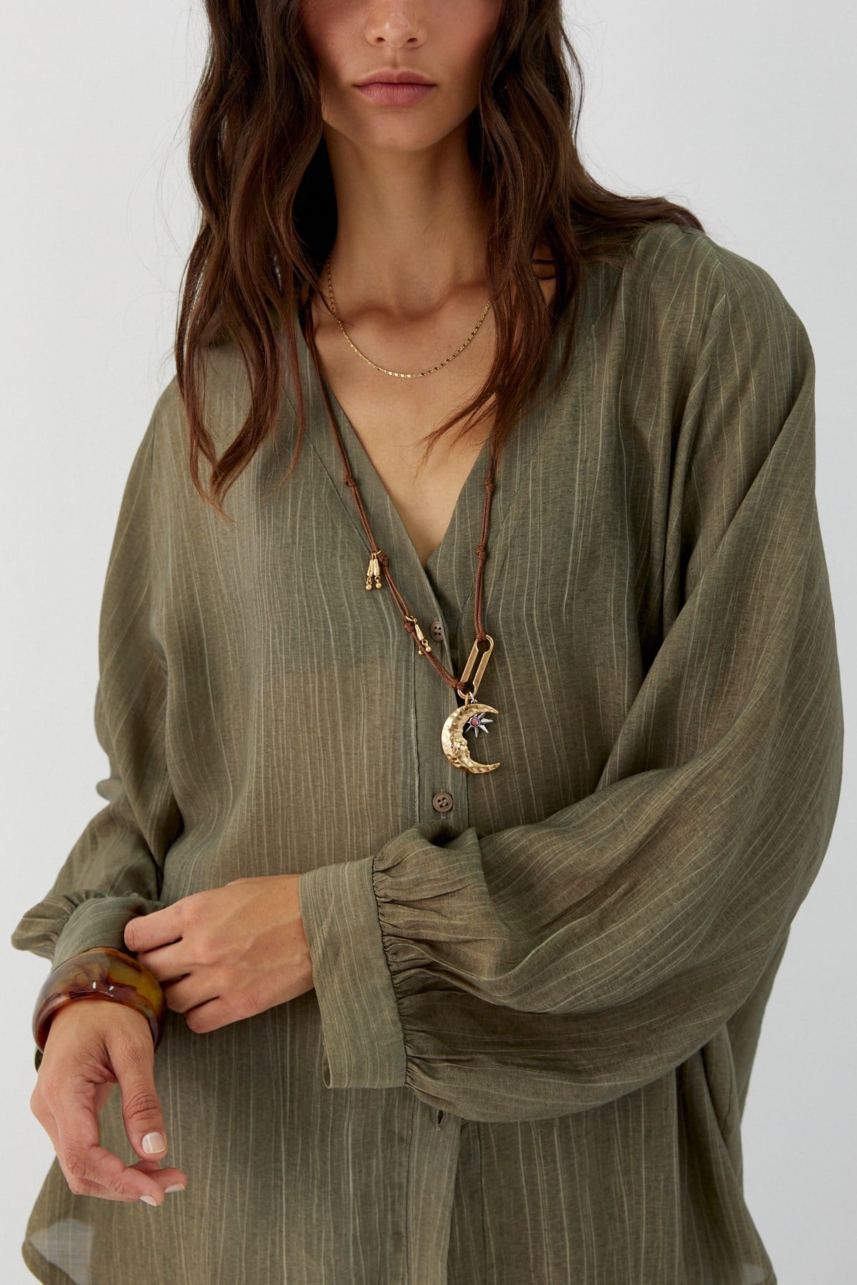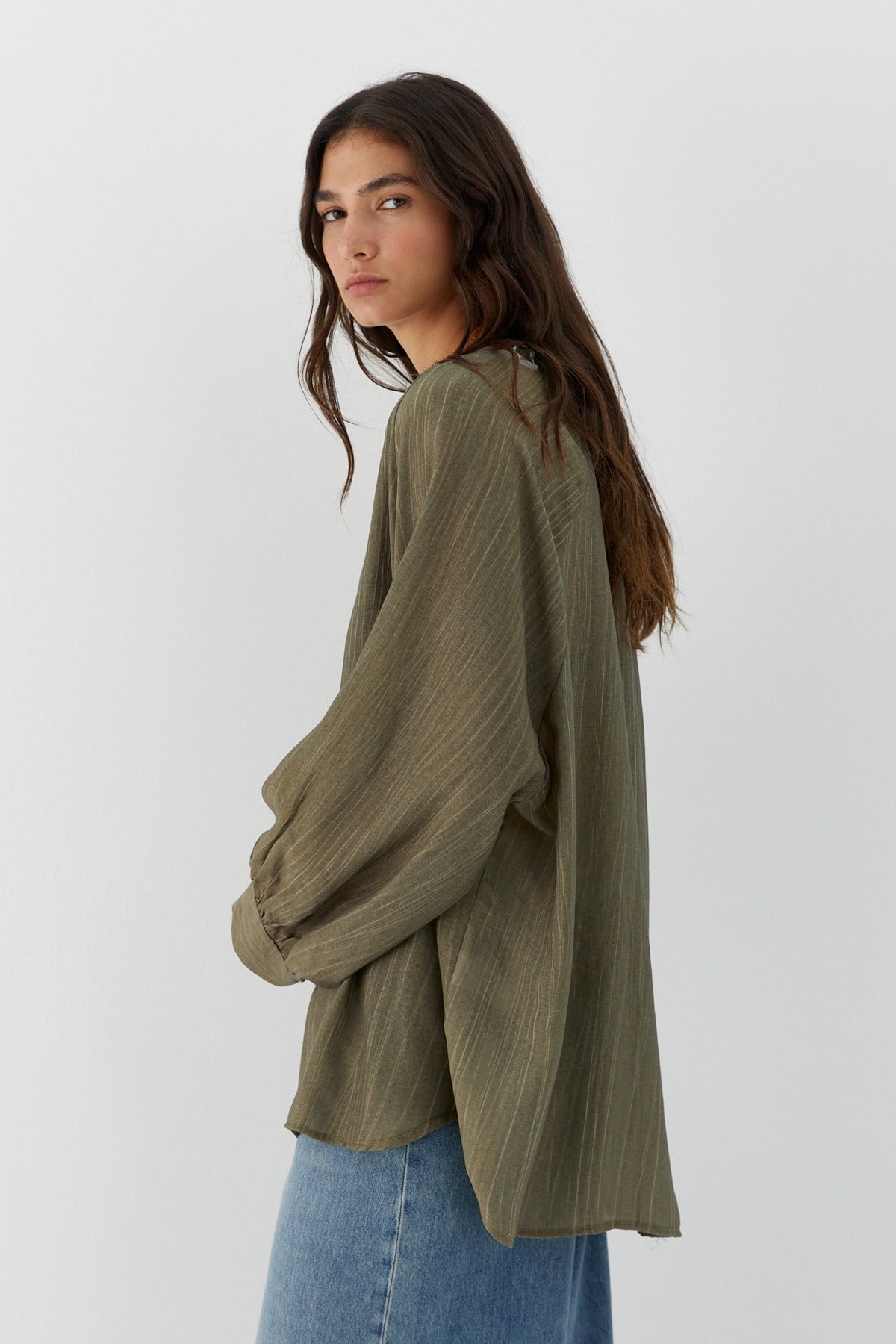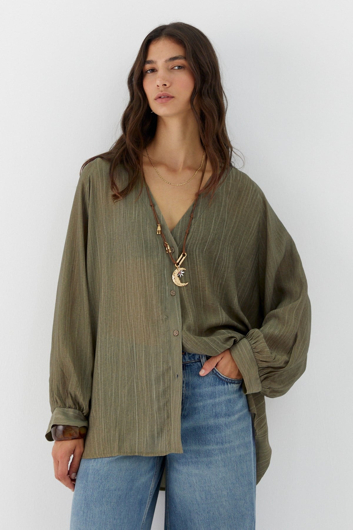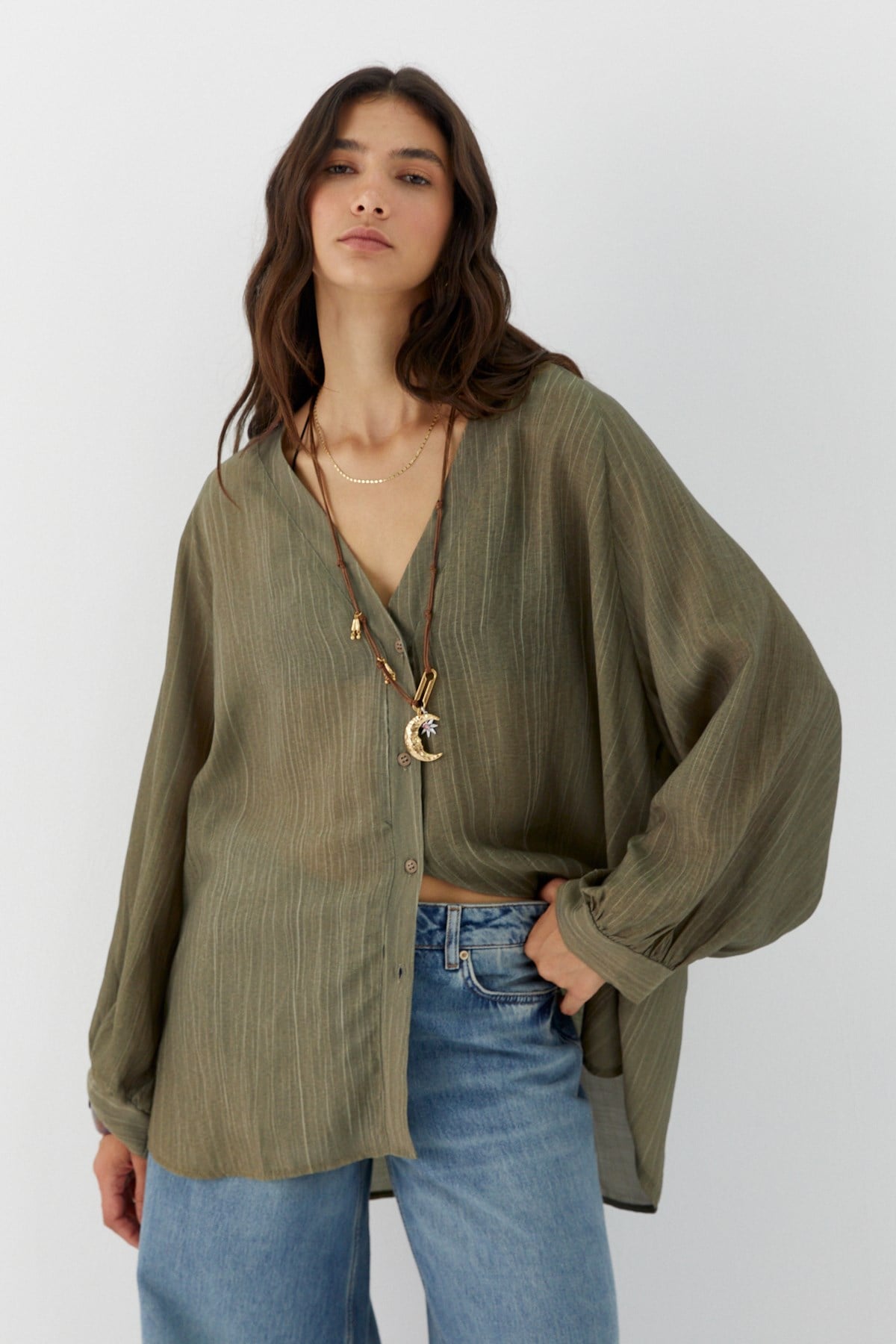 Oversize V Yaka Gömlek Haki (FN9088_020)