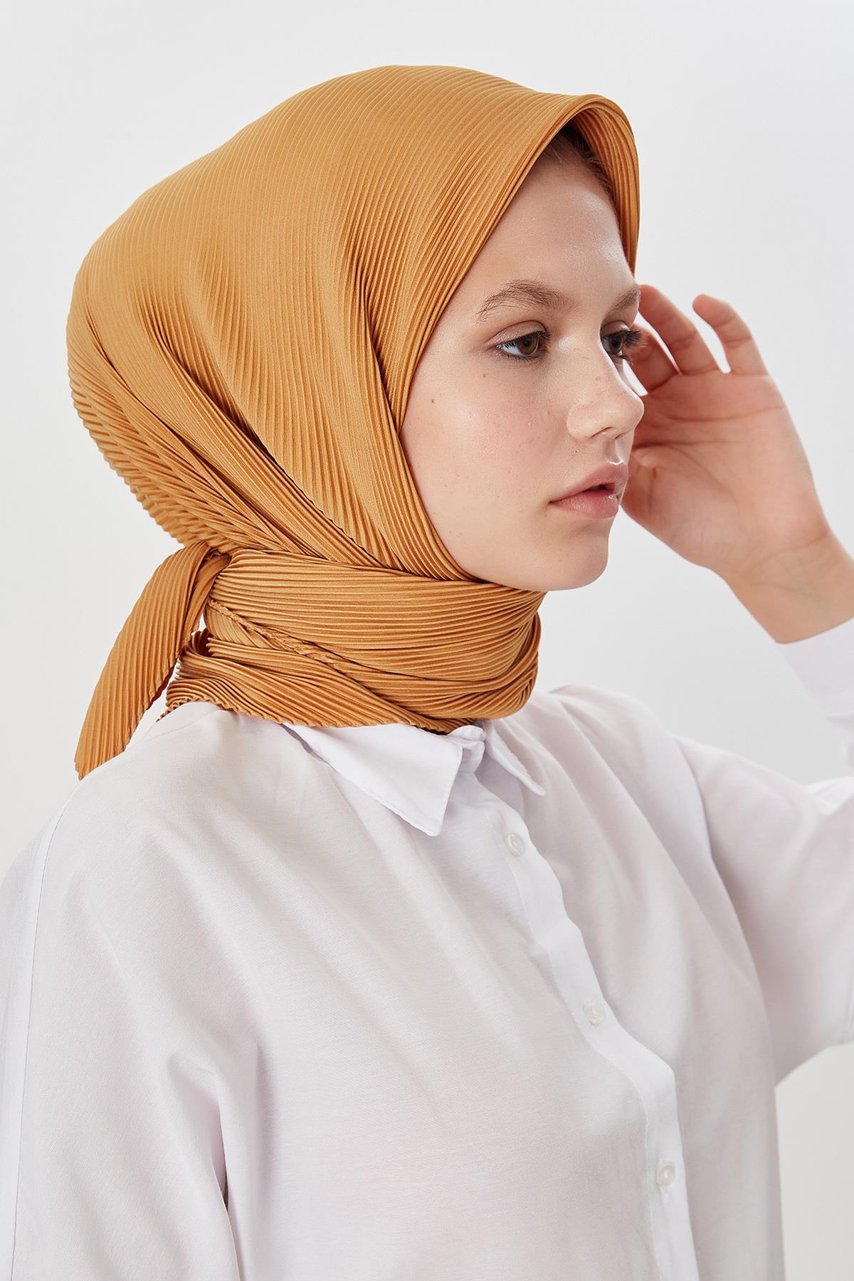 Pilise eşarp, ince piliseli dokusu ve trend renkleriyle kombinlerinde farklı bir parça isteyen müşterilerimiz için üretilmiştir. 4 mevsim kullanıma uygundur. İç göstermez. Kumaşı pamuk satendir. Eşarp kumaş içeriği %100 Polyesterdir. Özel kutulu ambalaj ile gönderilmektedir. Eşarp şekli kare değil eşkenar üçgendir. Ölçüleri 104 X 105 cm İçerik % 100 Polyester Makinede yıkanmaz. Ütü/buhar kullanılmaz. Kuru temizleme yapılması önerilir.